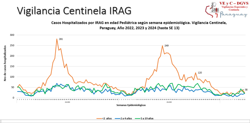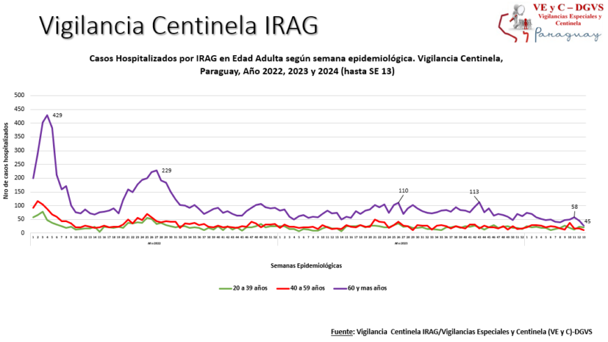 En los centros centinela se registraron 128 hospitalizados por infecciones respiratorias agudas graves (IRAG), 52% corresponde a la edad pediátrica; siendo el 36% menores de 2 años, 48% corresponde a la edad adulta, y el 46% son mayores de 60 años.