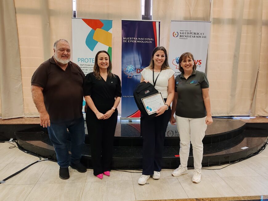 En la modalidad póster, el primer puesto de la Muestra llevó “Brote por Salmonella entérica serovariedad Baildon, en pacientes ambulatorios y hospitalizados en un Servicio de Salud, Itauguá Central, 2024”, elaborado por Rossana Prado, David Alvarenga, Bibi Garcete, Perla Sosa, Natalie Weiler, Mercedes Álvarez, Mario F. Martínez, Verónica Orrego, Flavia Helena Ortiz, Jazmín Martínez; Liz Acosta, Mirtha Casco, Ruth Gonzalez, Violeta González, Karin Volkart , Asunción Orihuela, Elizabeth Vázquez, Mercedes Estigarribia, Rosalina Bordón , Ana Laura Núñez, Sofía Oviedo Lara y Nilda Guerreño Maldonado.