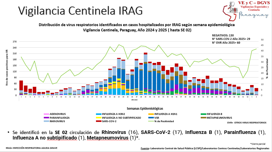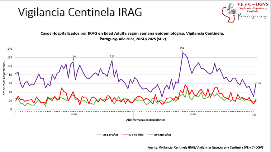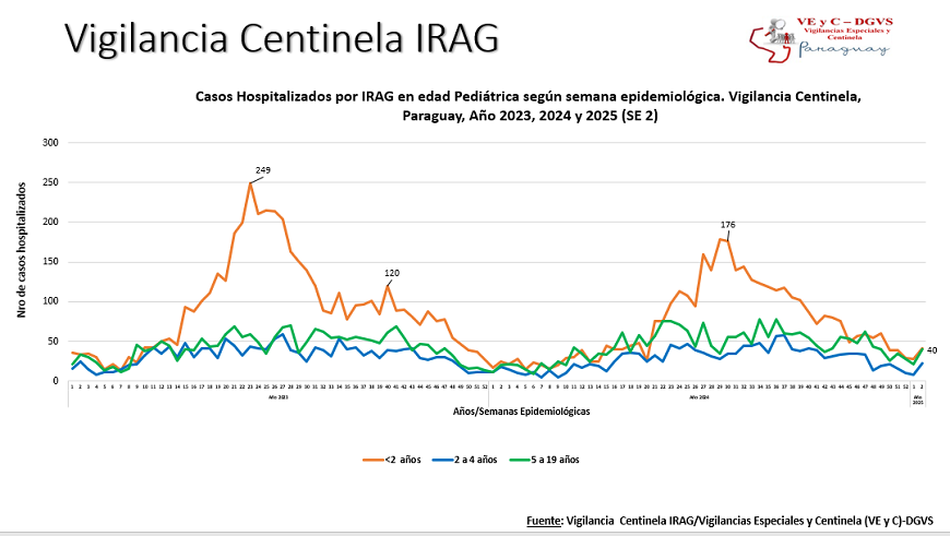 En cuanto a la proporción de hospitalizados, en los Centros Centinelas se reporta un incremento de 8% con relación a la semana anterior. Hasta la (SE) 02 se contabilizaron un total de 326 hospitalizados por infecciones respiratorias agudas graves (IRAG). El 51% de las internaciones se concentra en la edad adulta, siendo el 28% mayores de 60 años. En tanto que el 49% corresponde a la edad pediátrica, con predominio en menores de 2 años en el 21% de los casos.