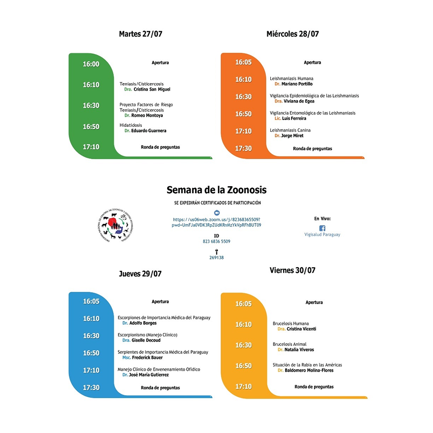 Del 27 al 30 de julio se llevará adelante jornadas de charlas virtuales denominadas “Semana de las Zoonosis”, organizado por el Programa Nacional de Control de Zoonosis y Centro Antirrábico Nacional (PNCZ-CAN) en coordinación con la Dirección de Vigilancia de Enfermedades Transmisibles. Las jornadas se desarrollarán desde las 16:00, a través de la plataforma Zoom y se transmitirá en vivo desde la fanpage de Vigisalud Paraguay, en Facebook.