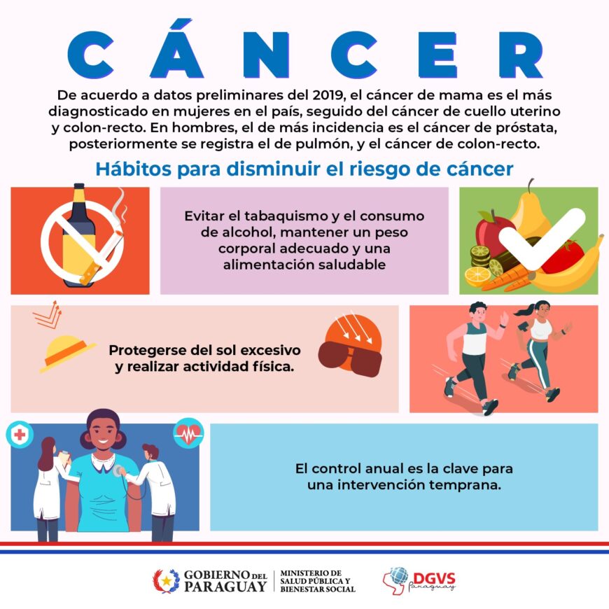 Desde la Dirección de Vigilancia de Enfermedades No Transmisibles se enfatiza la importancia de desarrollar un estilo de vida saludable mediante el ejercicio regular, la dieta equilibrada, no consumir productos tóxicos como el tabaco y alcohol, dormir las horas suficientes de sueño reparador, y mantener un estado de ánimo positivo son claves para mitigar la oncogénesis (generación del cáncer).