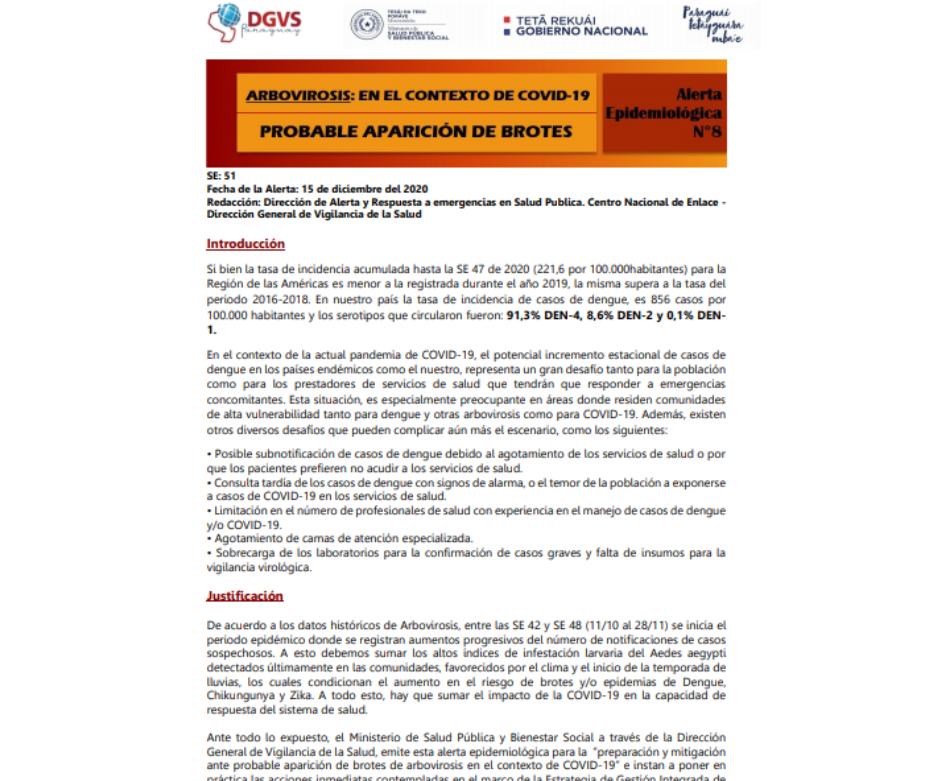 El Ministerio de Salud Pública y Bienestar Social, a través de la Dirección General de Vigilancia de la Salud emite alerta epidemiológica para la preparación y mitigación ante probable aparición de brotes de arbovirosis en el contexto COVID-19 e instan a poner en práctica las acciones inmediatas contempladas en el marco de la Estrategia de Gestión Integrada de Arbovirosis (EGI) para la prevención y control de las enfermedades transmitidas por Aedes aegypti (Dengue, Chikungunya y Zika), en todos los departamentos del país.