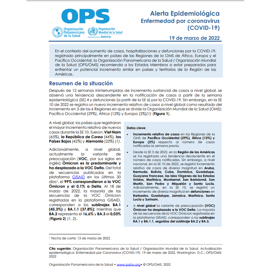 Se insta a los Estados Miembros a que se mantengan en alerta para detectar cambios clínicos, epidemiológicos y virológicos, y detectar cambios en la tendencia de casos, hospitalizaciones y/o defunciones, principalmente en áreas con mayor proporción de población no vacunada o parcialmente vacunada y en la población con mayor riesgo de desarrollar formas graves de la COVID-19 (pacientes con comorbilidades, inmunocomprometidos, mayores de 60 años, embarazadas, población viviendo en condiciones de hacinamiento, población con dificultades de acceso a servicios de salud, entre otros).
