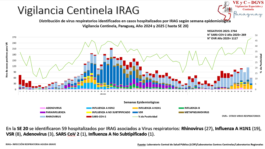 A la fecha, en los centros centinela se registra un acumulado de 4.454 hospitalizados por infecciones respiratorias agudas graves (IRAG), de los cuales, 328 corresponden a ingresos de la última semana, evidenciando un aumento con relación a la semana anterior. La mayoría de las hospitalizaciones están asociadas a Rhinovirus (46%), Influenza A H1N1 (32%) y Virus Sincitial Respiratorio (14%). En menor proporción, Influenza A No Subtipificada, Adenovirus y SARS-CoV2.