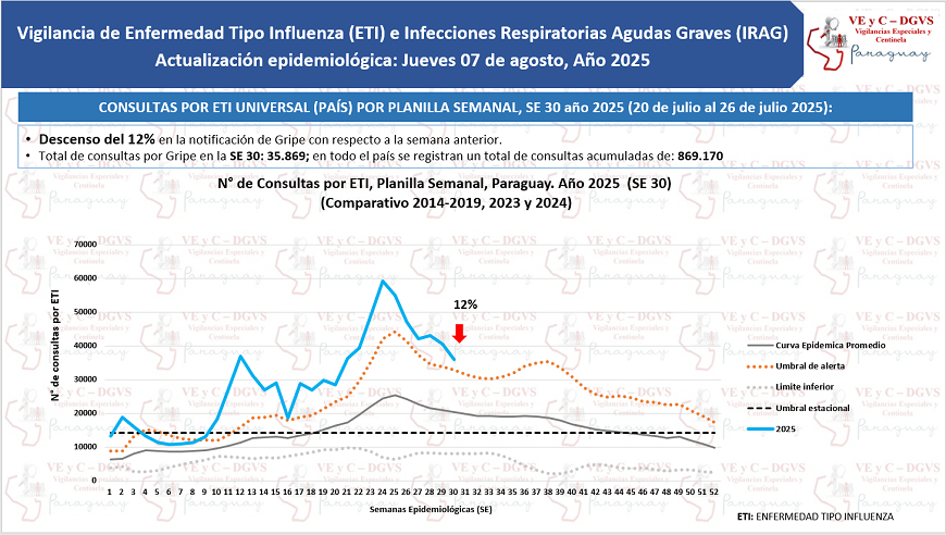 Contar con la dosis anual de la vacuna contra la Influenza y el COVID-19 es clave para reducir el riesgo de hospitalizaciones y muertes asociadas por estas enfermedades. Así también es importante mantener al día el esquema de vacunación regular de los niños, principalmente en los menores de 5 años. Consultar los puntos de vacunación en: vacunate.gov.py
