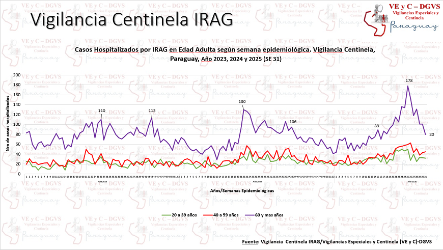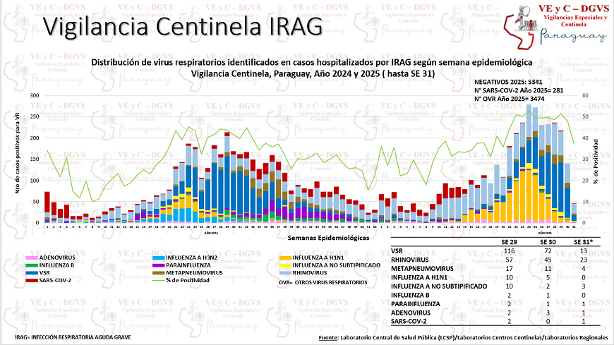Por otra parte, unas 337 personas fueron hospitalizadas por infecciones respiratorias agudas graves (IRAG), evidenciando un leve descenso de 21%, con relación a la semana anterior, en los centros centinela. El 22% de los hospitalizados ingresó a la Unidad de Cuidados Intensivos y 4% falleció.