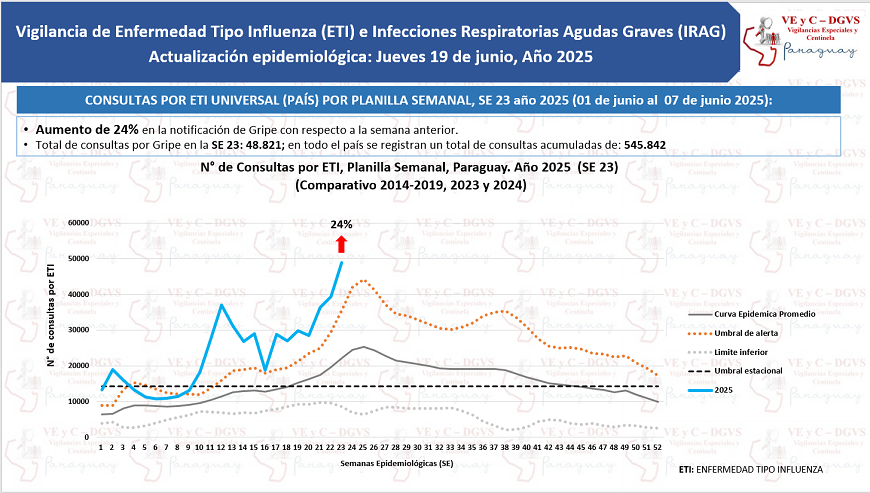 Datos actualizados de Vigilancia de la Salud señalan que al cierre de la última semana (SE) 23 se notificaron 48.821 consultas por gripe, que corresponde a un incremento del 24% con relación a la semana anterior.