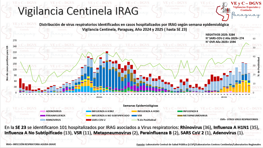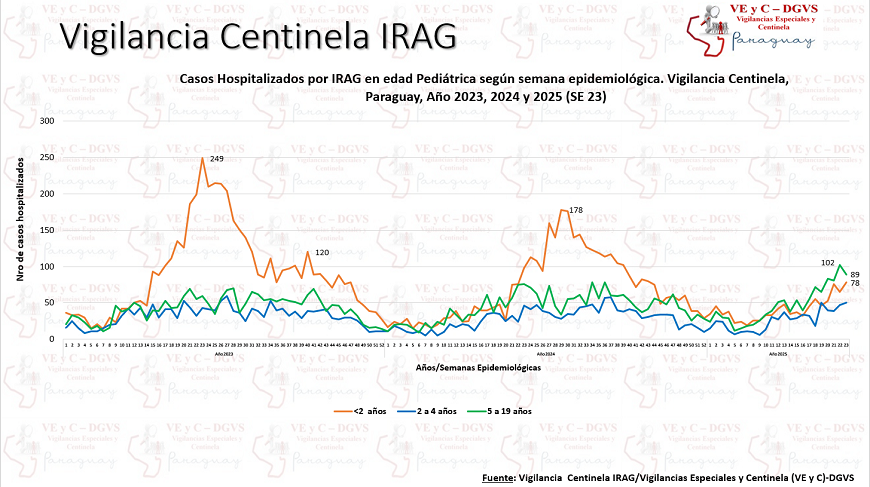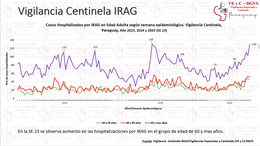 La Vigilancia Centinela muestra un aumento del 8% en los hospitalizados por infecciones respiratorias agudas graves (IRAG). En la última semana, 448 pacientes fueron internados por infecciones respiratorias, de los cuales, 17% ingresó a la unidad de cuidados intensivos y 10% falleció. Entre los más afectados encabeza la franja de adultos mayores de 60 años (30%), le sigue el grupo de 5 a 19 años (19%) y el de niños de menos de 2 años (16%).