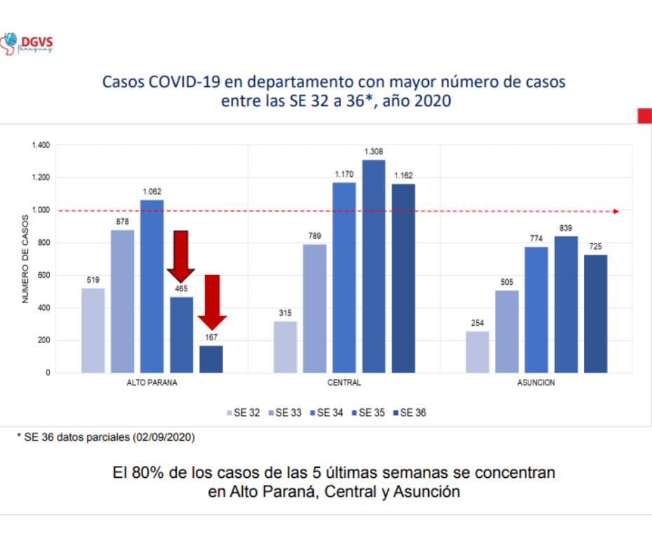 Se observa una curva de descenso de contagios en todo el departamento; mientras que Central y Asunción experimentan un ascenso acelerado en la cifra de infectados con el virus.