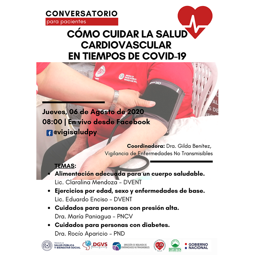 Este jueves 6 de agosto, te invitamos a conectarte a la red social Facebook para conozcas “Cómo cuidar la salud cardiovascular en tiempos de COVID-19”, en el marco de un conversatorio que será presentado por la Dirección de Enfermedades No Transmisibles, en conjunto con el Programa Nacional de Prevención Cardiovascular y el Programa Nacional de Diabetes.