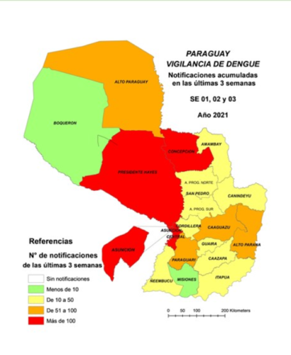 Por otra parte, Cordillera, San Pedro Sur, Guairá, Canindeyú, Ñeembucú, Itapúa, Caazapá, San Pedro Norte y Amambay contabilizan de 10 a 50 notificaciones de la enfermedad. Cifras equivalentes reflejan los departamentos de Alto Paraguay, Pdte. Hayes, Paraguarí, Caaguazú y Alto Paraná.