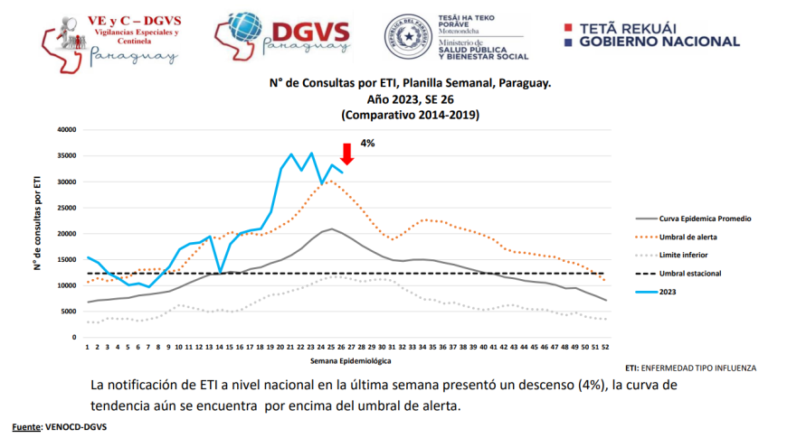 A nivel país se experimenta un ligero descenso de 4% en la demanda de consultas por enfermedades tipo influenza (ETI); sin embargo, la curva de tendencia aún se mantiene por encima del umbral de alerta, de acuerdo al último reporte del Programa de Vigilancias Especiales y Centinela de la Dirección de Vigilancia de la Salud.