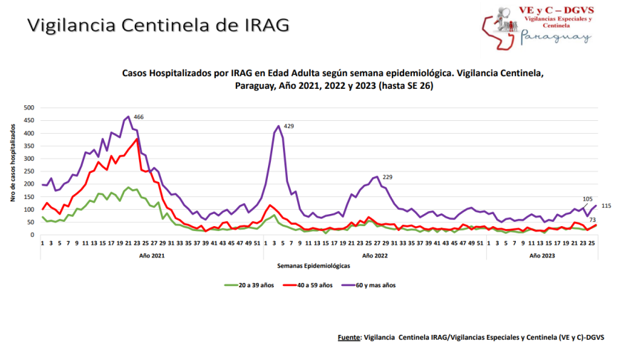 En tanto que, en los centros centinelas se evidencia aumento de hospitalizados de 18% con relación a la semana anterior. En los últimos días, (SE) 26, se contabilizaron 515 internaciones por infecciones respiratorias agudas graves (IRAG), de los cuales, el 63% corresponde a la edad pediátrica. El mayor porcentaje de hospitalizaciones, el 66% de los casos se identificó en el grupo de niños menores de 2 años y 37% se verificó en la edad adulta.