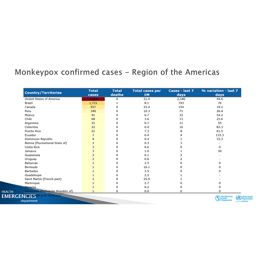 Adicionalmente se han notificado un total de 113 casos probables y 861 casos sospechosos. Así también, se notificó la primera muerte en la Región relacionada con la viruela símica, en Brasil.