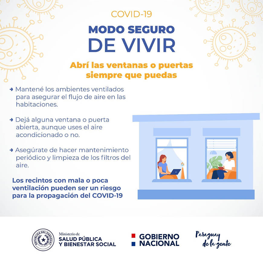 - Al hablar, cantar, toser o estornudar, incluso al respirar la persona infectada emite partículas del SARS-CoV2 que pueden permanecer en el aire por largo tiempo. Al abrir puertas y ventanas, el aire circula y esto favorece para que estas partículas se diluyan.