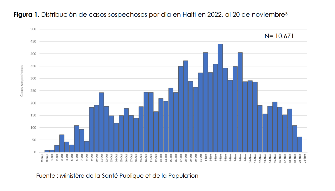 La Organización Panamericana de la Salud (OPS), en su actualización epidemiológica de cólera informa, del 02 al 20 de noviembre de 2022 se han notificado 11.039 casos sospechosos de cólera en 10 departamentos del país, incluidos 938 casos confirmados, 9.344 casos sospechosos internados y 202 defunciones. Los casos iniciaron en el gran Puerto Príncipe.