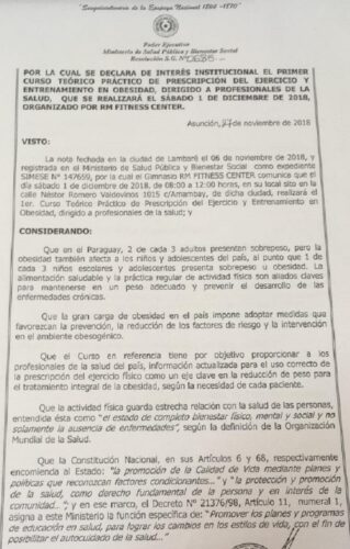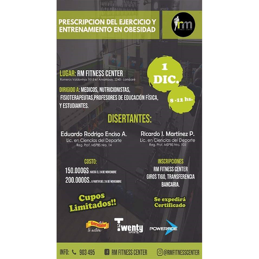 La actividad tendrá lugar el próximo 1 de diciembre, en el Gimnasio RM FITNESS CENTER, sito en Néstor Romero Valdovinos 1015 casi Amambay, de la ciudad de Lambaré. Uno de los disertantes es el Lic. Eduardo Enciso, de la Unidad de Actividad Física, dependiente de la Dirección de Vigilancia de Enfermedades No Transmisibles del Ministerio de Salud. Informes e inscripciones al 021-903.495; cupos limitados.