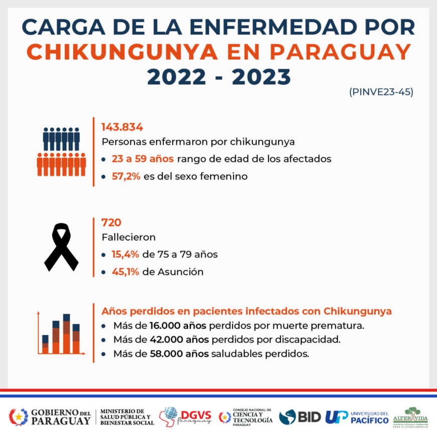 • En el periodo de estudio,143.834 personas contrajeron chikungunya. Cerca del 38% de los casos se identificaron en el departamento Central. En este periodo fallecieron unas 720 personas.