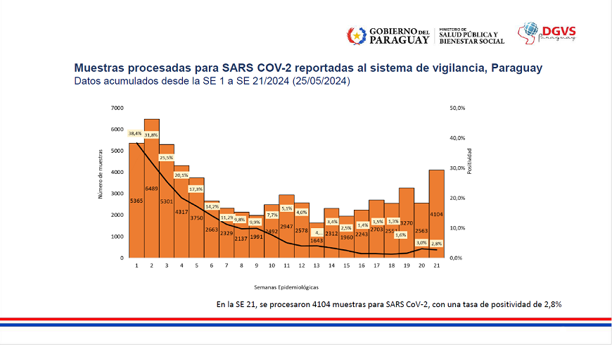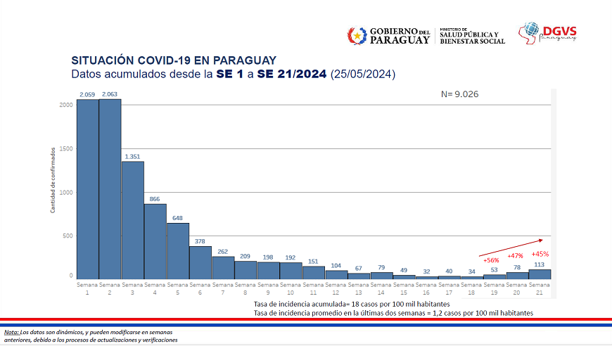 Hasta el momento, Paraguay experimenta una baja transmisión comunitaria Nivel 1. La tasa de positividad de casos es de 2,8%; mientras que la tasa de incidencia promedio en las últimas tres semanas es de 3,1 casos por 100.000 habitantes.