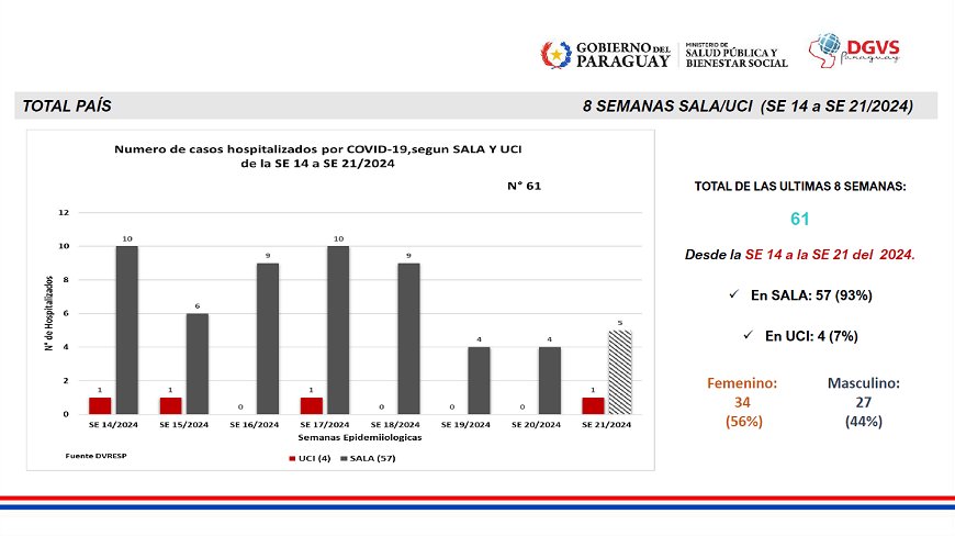 En las últimas ocho semanas, el 56% de los hospitalizados es del sexo femenino. En este periodo, el mayor porcentaje de internaciones por la infección se reporta principalmente en el grupo de 0 a 4 años, seguido de la franja de adultos mayores.