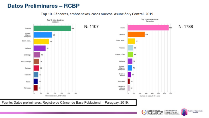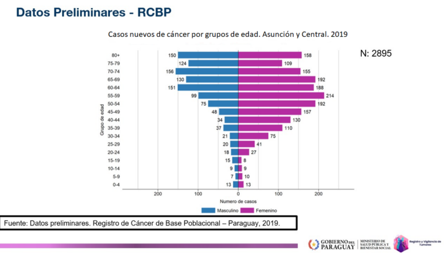 Datos preliminares del Registro de Cáncer de Base Poblacional del 2019 reportan cerca de 2.900 personas afectadas por cáncer en la zona geográfica de Asunción y Central que corresponde al 40% de la población del Paraguay. El mayor porcentaje se registró en mujeres con 1.788 casos y en hombres 1.107.