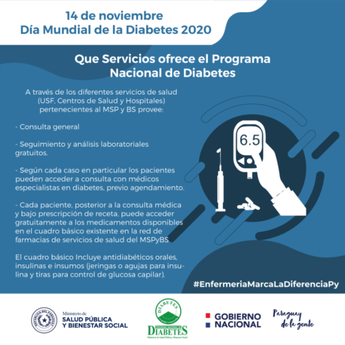 Cada paciente, posterior a la consulta médica y bajo prescripción de receta, puede acceder gratuitamente a los medicamentos disponibles en el cuadro básico existente en la red de farmacias de servicios de salud del MSPyBS. El cuadro básico Incluye antidiabéticos orales, insulinas e insumos (jeringas o agujas para insulina y tiras para control de glucosa capilar).