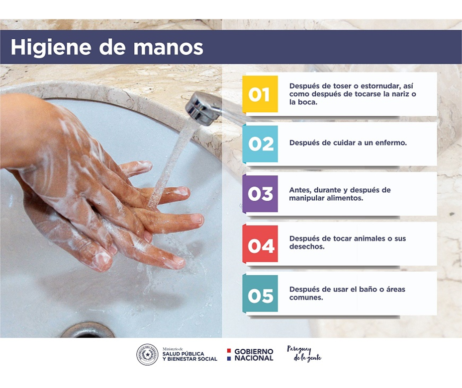 Se recomienda cartelería plastificada de fácil desinfección en los puntos de higiene de manos, que grafique los pasos a seguir.