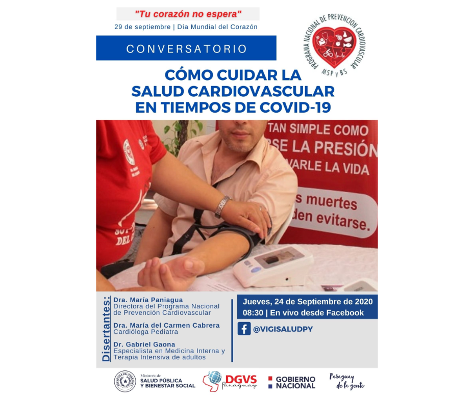 “Cómo cuidar la salud cardiovascular en tiempos de COVID-19” es el tema central del conversatorio que será desarrollado este jueves 24 de septiembre, como anticipo al Día Mundial del Corazón y será presentado por la Dirección de Vigilancia de Enfermedades No Transmisibles, en conjunto con el Programa Nacional de Prevención Cardiovascular.