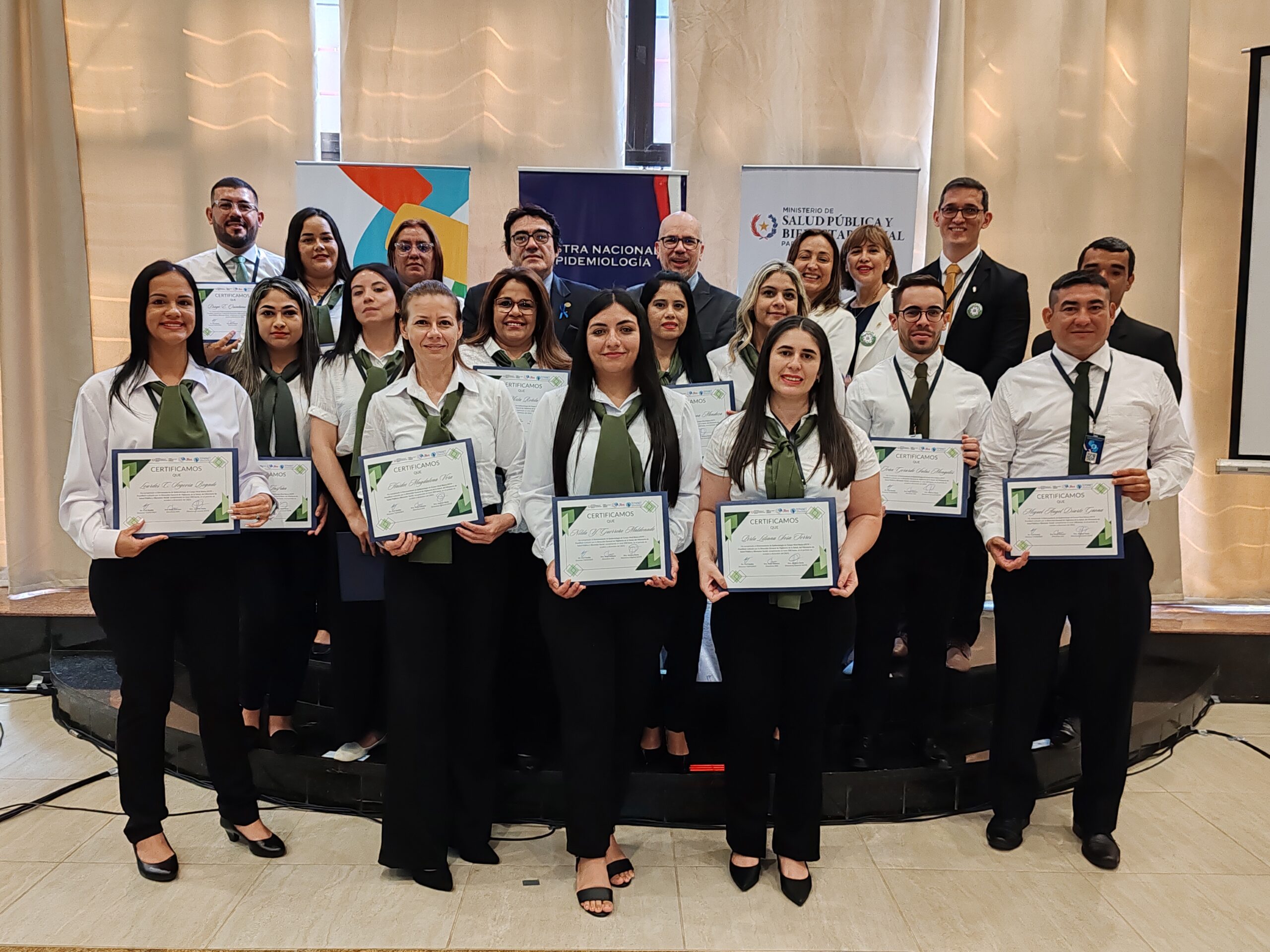 Seguidamente tuvo lugar el acto de graduación de 36 profesionales del Nivel Básico o Frontline de las cohortes 14° y 16° con enfoque Una Salud, del Programa de Entrenamiento en Epidemiología de Campo – PEEC Paraguay.