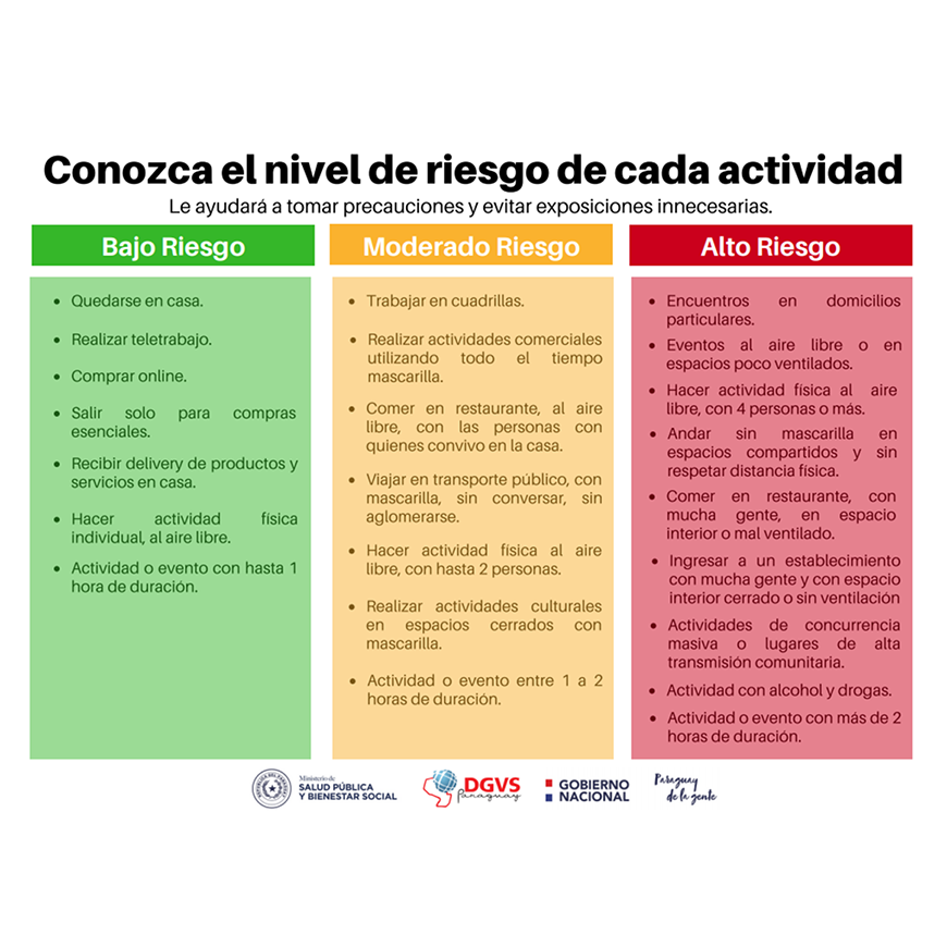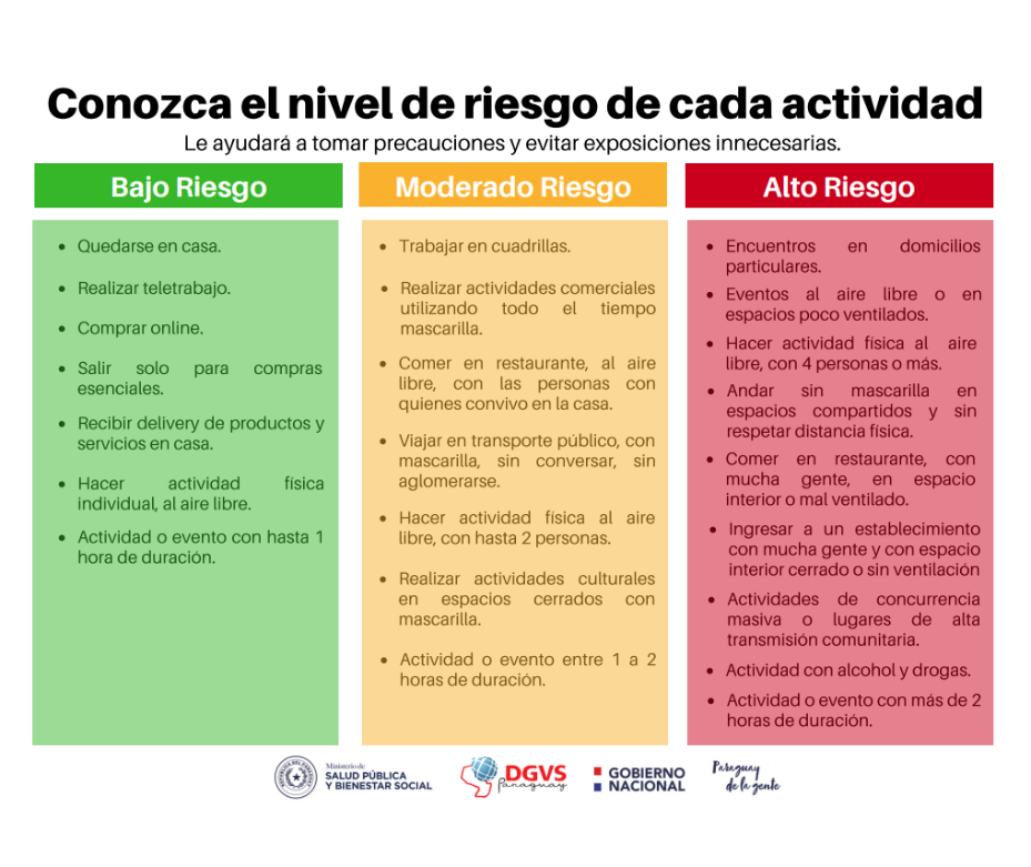 A continuación, se enumeran más de 20 actividades consideradas de riesgo para contraer el virus pandémico. Estas fueron clasificadas en tres niveles de riesgo: bajo, moderado y de alto riesgo.