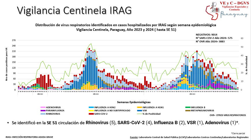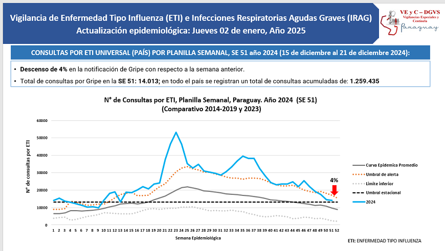 A nivel país se notificaron 14.013 consultas por gripe al cierre de la semana (SE) 51, evidenciando un leve descenso de 4% con relación a la semana anterior. Con esto, la curva de tendencia se sitúa por debajo del umbral de alerta.