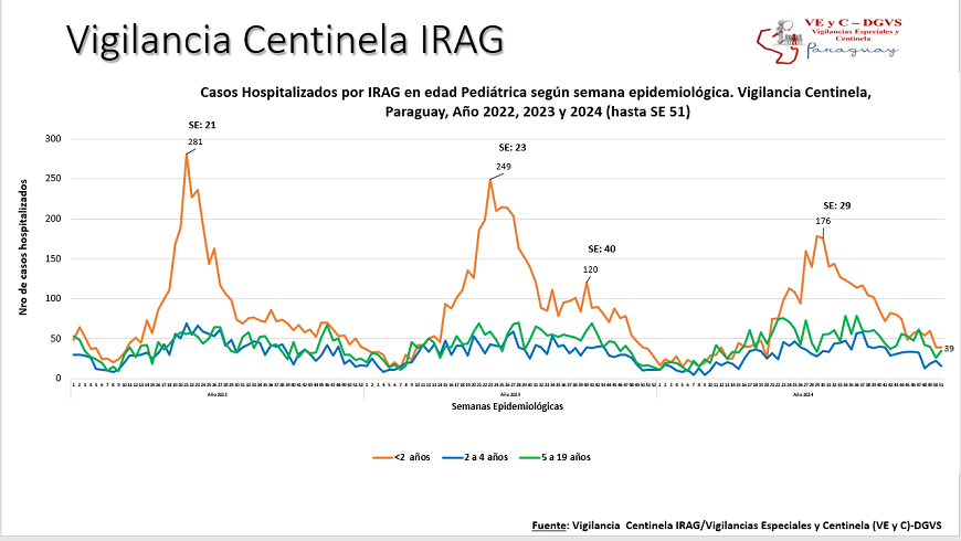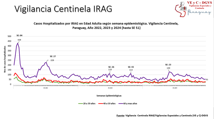 El reporte actualizado muestra que en esta última semana se contabilizaron 192 hospitalizados por infecciones respiratorias agudas graves (IRAG) en los centros centinela, sin variaciones en comparación a la semana anterior. El 47% de las internaciones se registró en el grupo pediátrico, siendo el 43% menores de 2 años. En tanto que, el 53% de los hospitalizados corresponde a la edad adulta, de los cuales, el 52% son mayores de 60 años.