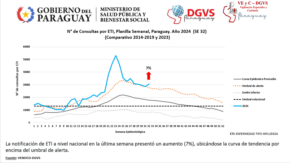 Según datos oficiales de Vigilancia de la Salud, al cierre de la semana (SE) 32 se observa un crecimiento en la notificación de cuadros respiratorios. En este periodo se identificaron 30.582 consultas por gripe a nivel país, lo que refleja un aumento de 7% con relación a la semana anterior. Con esto, la curva de tendencia se mantiene por encima del umbral de alerta.