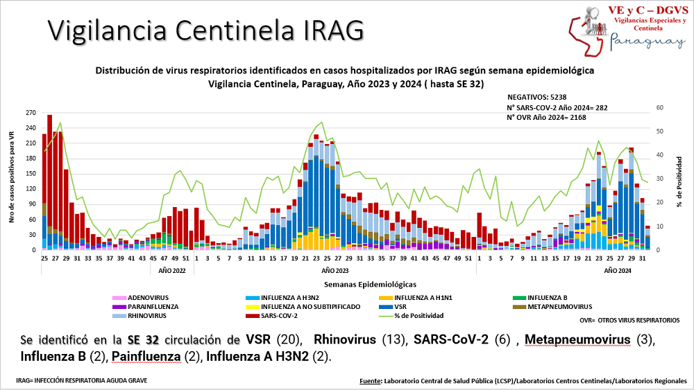 En cuanto a la proporción de hospitalizados, en los Centros Centinelas se reporta un incremento de 1% con relación a la semana anterior. En esta última semana se contabilizaron 388 hospitalizados por infecciones respiratorias agudas graves (IRAG), el 64% corresponde a la edad pediátrica, con predominio en menores de 2 años en el 60% de los casos. En tanto que, el 36% de las internaciones se concentra en la edad, siendo el 62% mayores de 60 años.