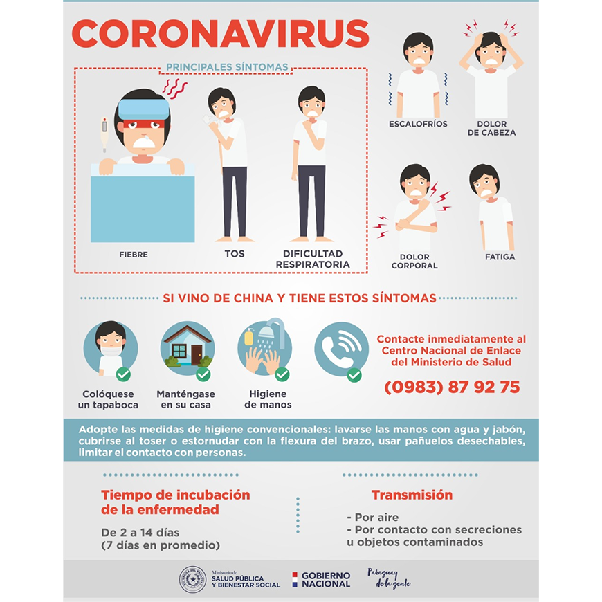 - En caso de presentar fiebre, tos, dificultad respiratoria u otro síntoma de enfermedad durante su estadía en Paraguay, contactar inmediatamente al Centro Nacional de Enlace del Ministerio de Salud (0983) 87 92 75 para recibir directrices por parte de las autoridades de salud del país.