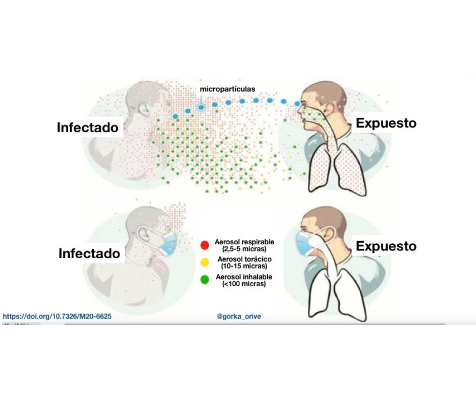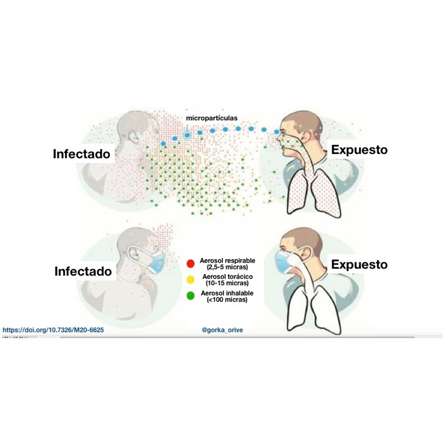 Cuando una persona infectada con el virus SARS-CoV2 habla, grita, tose o estornuda emite muchas partículas de diferentes tamaños, algunas caen al suelo o en superficies, y las más pequeñas pueden transportarse varios metros y permanecer en el aire por periodos prolongados. Estas microgotas o micropartículas respiratorias ingresan al organismo cuando la persona sin mascarilla las inhala, produciéndose de esta manera la infección por COVID-19.