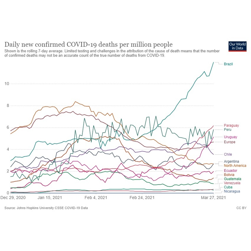 En el contexto regional, al cierre de la semana epidemiológica se observa que Paraguay se posiciona como el segundo país con más muertes diarias por millón de habitantes (6.17 promedio móvil de 7 días) y es superado por Brasil (11.96), señala el reporte semanal de COVID-19. Nuestro país exhibe una tendencia creciente en este indicador acercándose a la situación más crítica reportada en Europa (7.30 muertes por millón) y Norte América (8.38 muertes por millón) a finales de enero en la reciente ola que afectó a estas regiones en su temporada otoño-invierno.