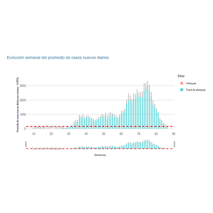 El promedio de casos nuevos diarios es de 146, con un valor probable de 177 en el 95% del intervalo de confianza y es significativamente inferior a la semana previa. Se reporta un cambio porcentual negativo con respecto a un promedio móvil de las semanas previas lo cual indica una tendencia decreciente por 11 semanas consecutivas de la curva epidémica.