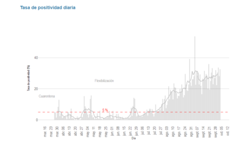 La tasa de positividad diaria está en torno al 30%, esto es, seis veces más que el valor recomendado por la OMS para el criterio de epidemia bajo control. En caso que el nivel de positividad registrado actualmente se dé dentro del pico epidemiológico, estaría dentro del rango esperado.