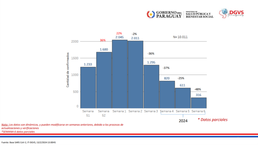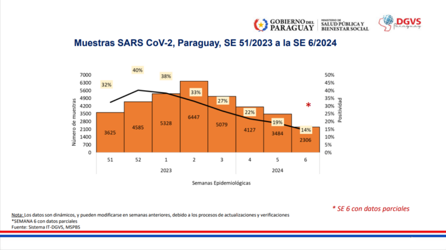 En las últimas tres semanas, la cifra de diagnósticos de COVID-19 en Paraguay llega a 1.747, de los cuales, 316 corresponden a nuevos casos reportados en la última semana (SE) 6, evidenciado una baja de contagios de 48% con relación a la semana anterior, según datos parciales. El mayor porcentaje de casos registrados se concentra en Central (34%), Asunción (31%), seguido de Itapúa (8%) y Guairá (6%). En este periodo se contabilizaron 2.306 muestras procesadas, registrando una alta positividad de 14%.