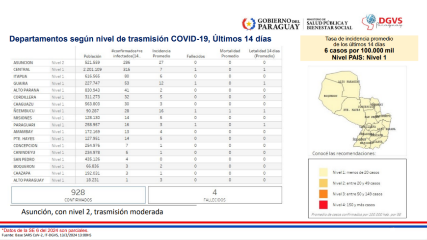 Si bien a nivel país el riesgo de transmisión es de Nivel 1, en Asunción se mantiene una transmisión moderada – Nivel 2.