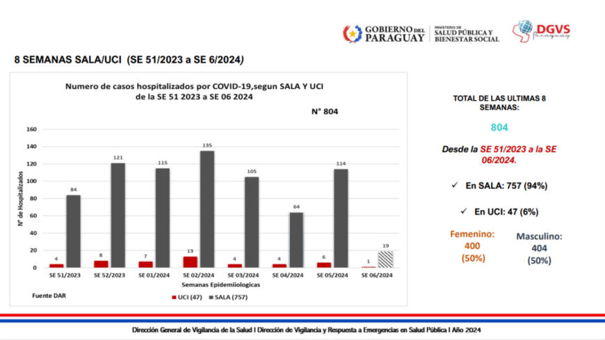 Cabe resaltar que el 64% de los casos confirmados en las últimas tres semanas corresponde al grupo de 20 a 59 años, 19% al de 60 años y más, y un 17% ocupa la franja pediátrica de 0 a 4 años de edad. El mayor porcentaje de personas afectadas por la enfermedad, es del sexo femenino con el 63%.