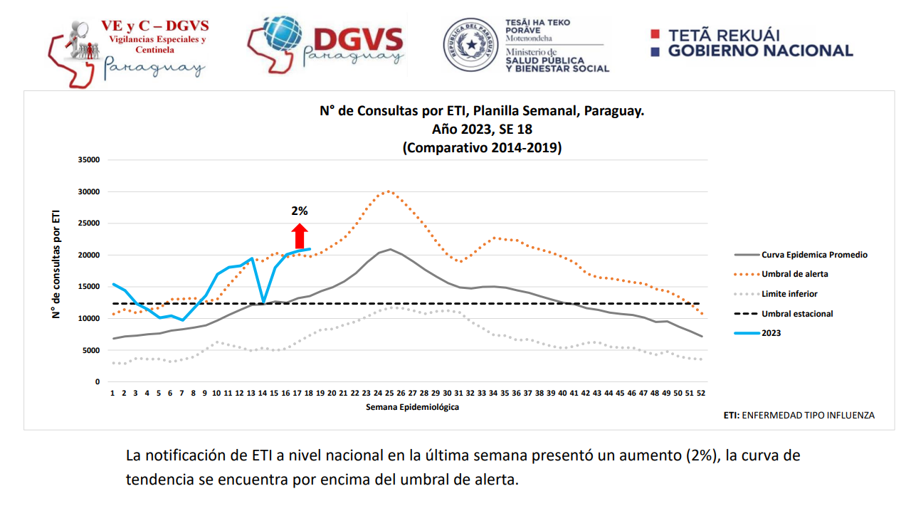 De acuerdo al sistema de Vigilancia Centinela de Enfermedad tipo Influenza (ETI) e Infecciones Respiratorias Agudas Graves (IRAG), en la última semana (SE) 18 se detecta un incremento de 2% en las consultas por enfermedades tipo influenza, sobrepasando el umbral de alerta. A nivel país se registra un total de 274.136 consultas por cuadros respiratorios.