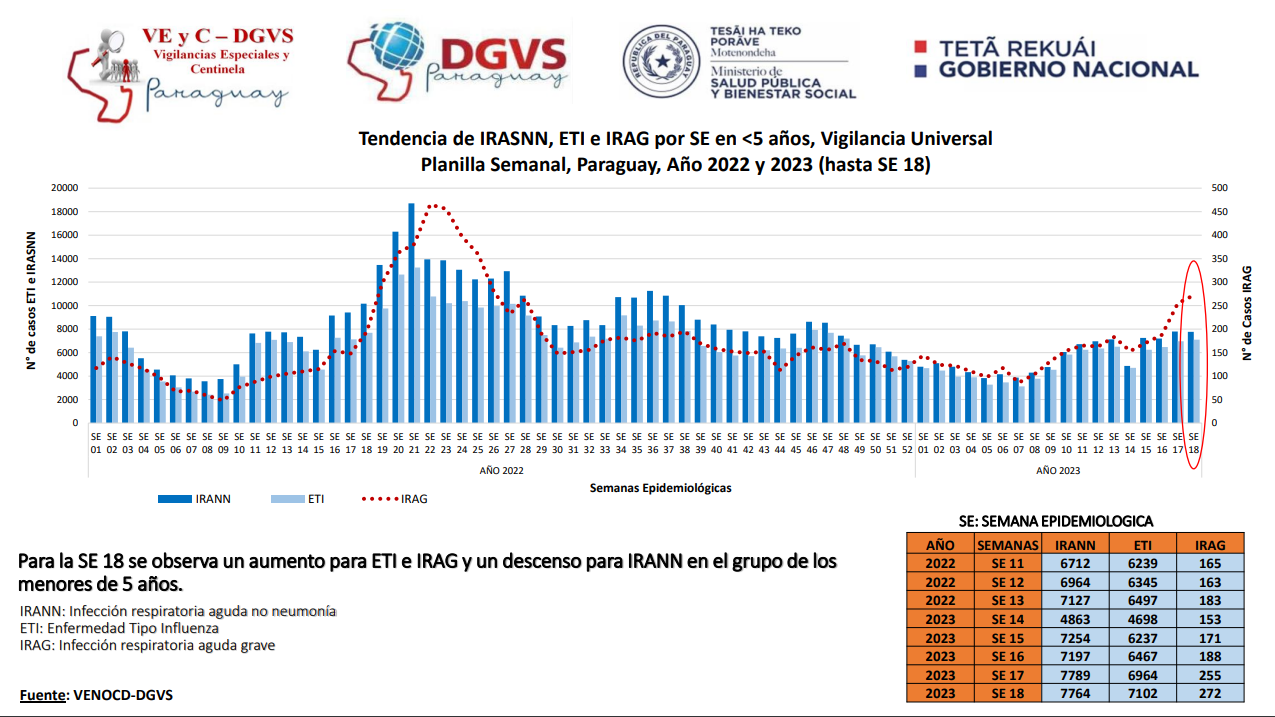 En los centros centinela se verifica un crecimiento de hospitalizados por infecciones respiratorias agudas graves, asociadas a virus respiratorio en edad pediátrica (93%), con predominio en niños menores de un año (51%). La mayor cifra de hospitalizados por virus sincitial respiratorio procede de Amambay (65%), seguido de Alto Paraná (11%) y Central (10%).