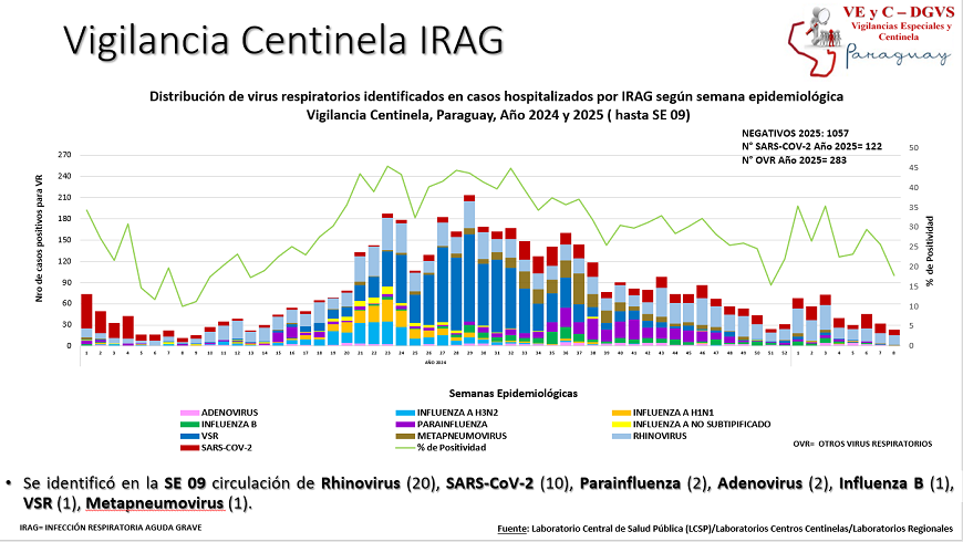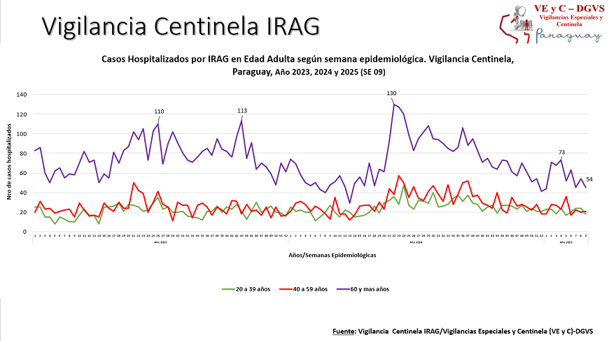 Hasta la (SE) 09 se contabilizaron 1.503 hospitalizados por infecciones respiratorias agudas graves (IRAG), de los cuales, 137 corresponde a los hospitalizados de la última semana; el mayor porcentaje de internados, el 33% se ubica en la franja adulta mayor de 60 años, seguido del grupo pediátrico.