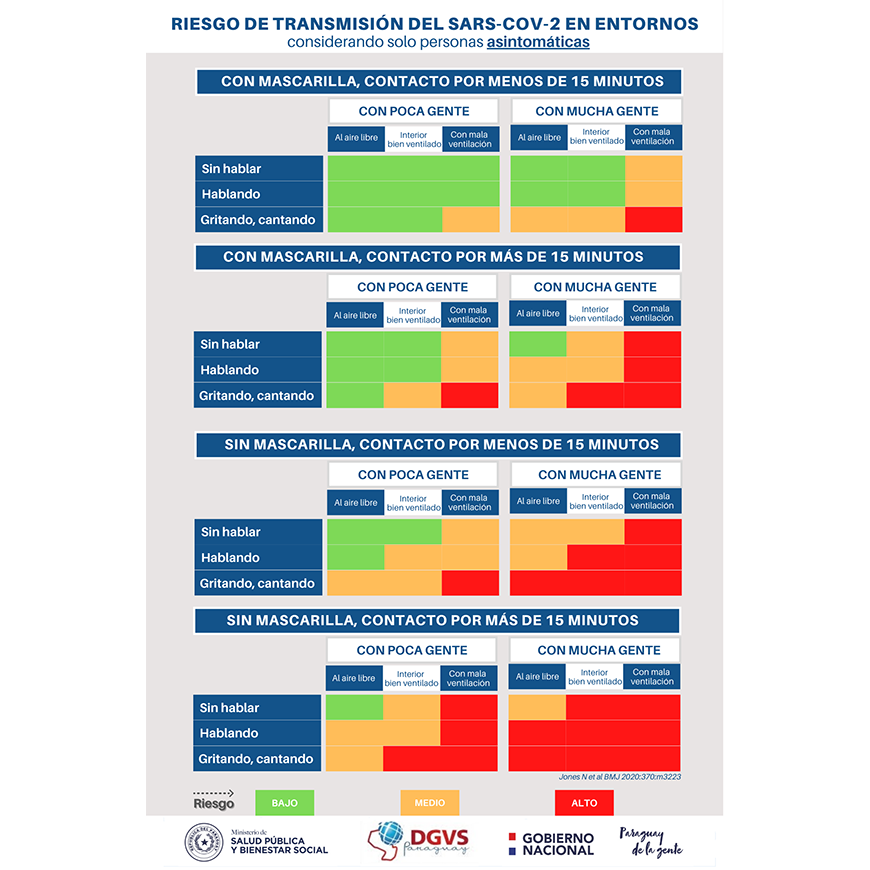 Conozca los niveles de riesgo al que está expuesto todo individuo cuando entra en contacto con otro, aparentemente sin el virus, durante sus actividades cotidianas; cómo incide el tiempo de exposición, la ventilación del ambiente y el uso de mascarilla.