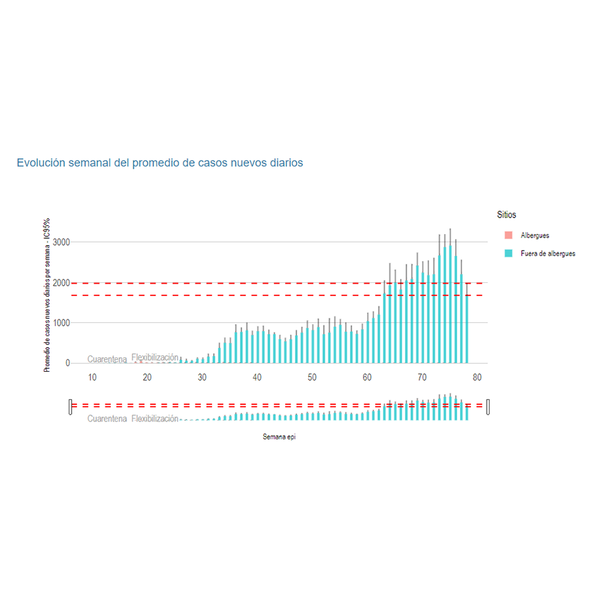 El Reporte Semanal de COVID-19 en Paraguay expone que el promedio diario de casos nuevos es de 1680, con un valor probable de 1977 en el 95% del intervalo de confianza y es significativamente inferior a la semana previa. Se reporta un cambio porcentual negativo con respecto a un promedio móvil de las semanas previas, lo cual indica una tendencia decreciente por tres semanas consecutivas en la curva epidémica.