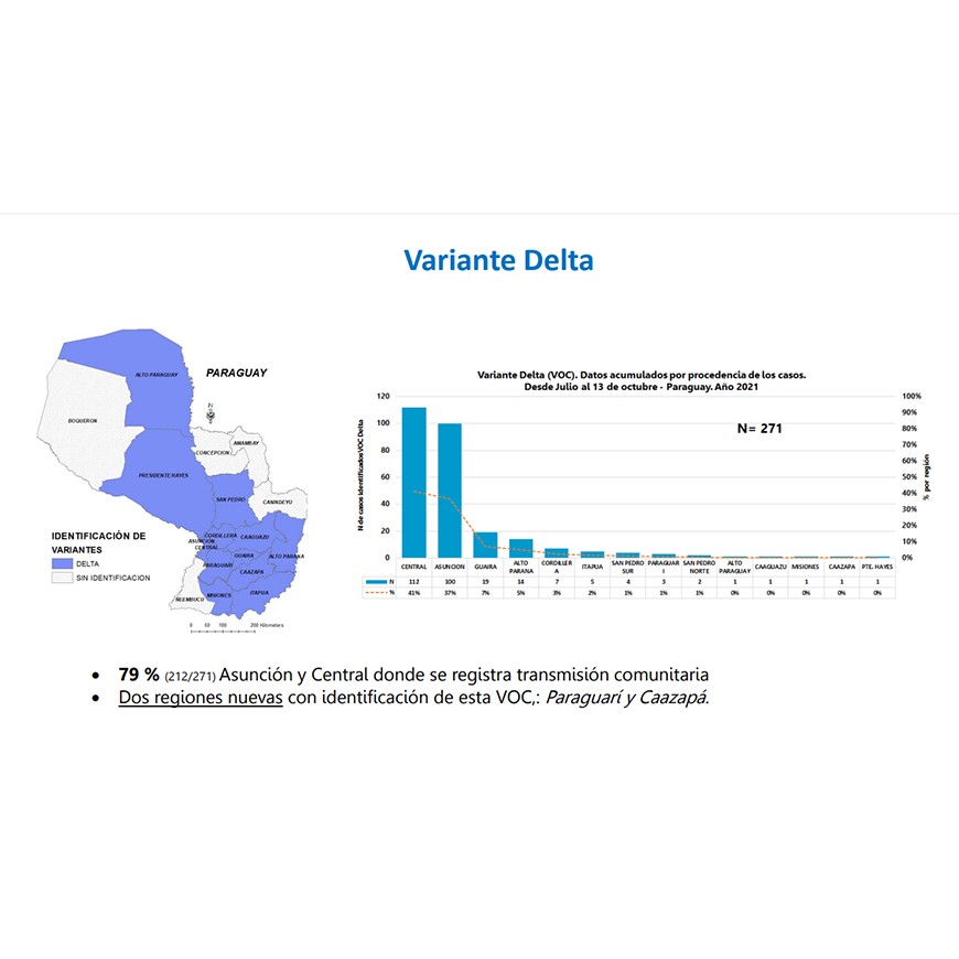 De acuerdo al reporte acumulado de la Vigilancia Genómica, de julio a la fecha suman 271 los casos de la variante delta en Paraguay. El 79% de los hallazgos corresponde a Asunción y Central. Estos casos fueron verificados en 13 regiones del país: Central, Asunción, Alto Paraná, Cordillera, San Pedro Norte y Sur, Itapúa, Alto Paraguay, Caaguazú, Misiones, Guairá y Pdte. Hayes, y se añaden esta semana, Caazapá y Paraguarí.