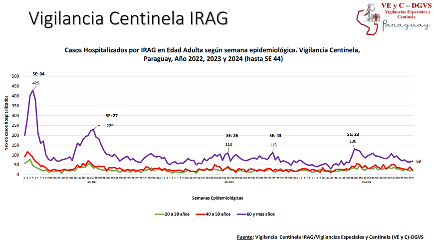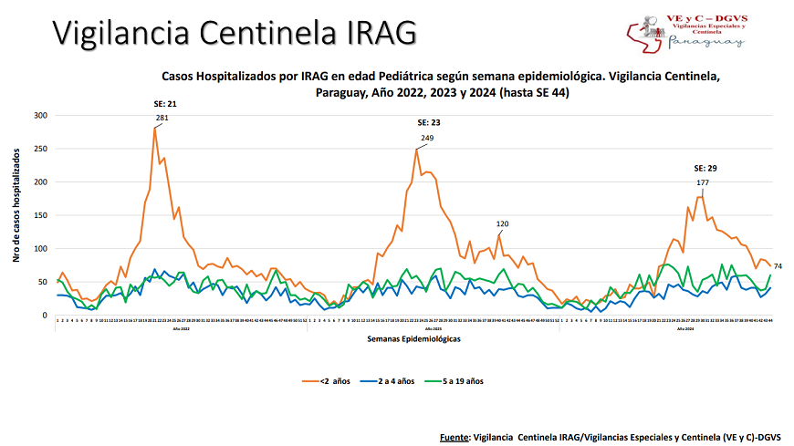 En este periodo se contabilizaron 294 hospitalizados por infecciones respiratorias agudas graves (IRAG) en los Centros Centinela. La mayoría de los casos hospitalizados está asociado a cuadros de Rhinovirus y SARS-CoV2. El 60% de las internaciones corresponde a la edad pediátrica, 42% son menores de 2 años. En tanto que 40% de los hospitalizados es de la edad adulta, siendo el 58% mayores de 60 años.