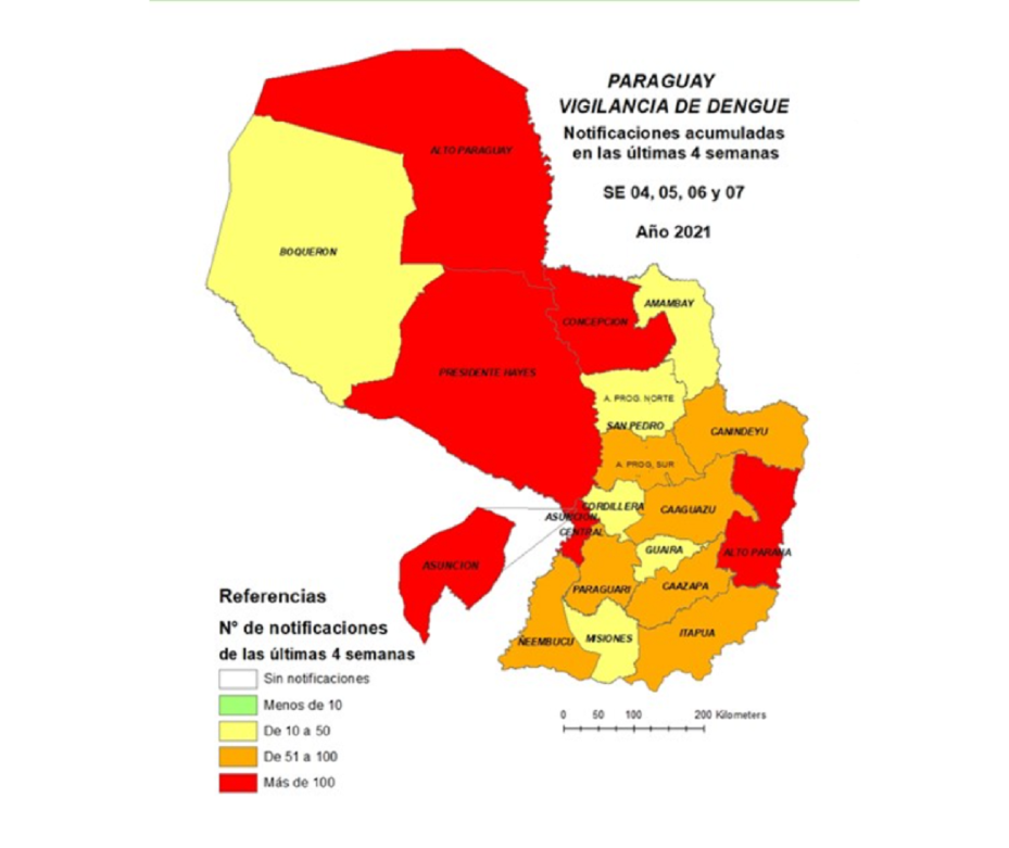 Asunción, Central, Alto Paraná, Concepción, Pdte. Hayes y Alto Paraguay son consideradas “zonas rojas” con notificaciones por encima de 100 registradas en las últimas cuatro semanas.